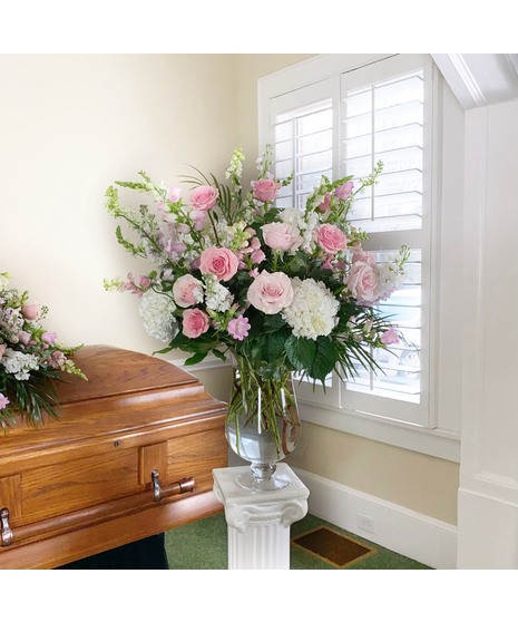 For a life well-lived, let our Grand Expression vase arrangement honor the impact they left on our hearts. Soft pink roses and creamy white hydrangea are complimented with snapdragons, fragrant stock, campanula, and textural greens.