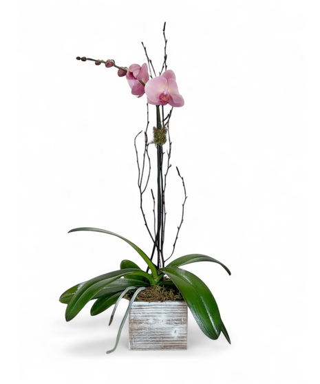 Classic and delicate. Color Phalaenopsis Orchid plant accented with green moss and birch in a neutral, light-colored container.