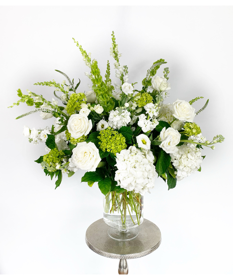 Make a big impact with elegant white and verdant flowers with our Statement of Sympathy vase arrangement. It includes white roses, hydrangea, lisianthus, and graceful line flowers.