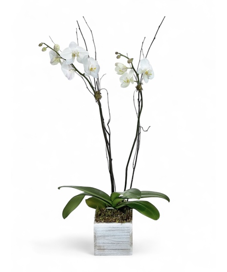 Classic and delicate. Double white Phalaenopsis Orchid plant accented with green moss and birch in a neutral, light-colored container.